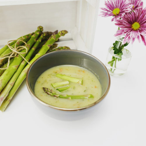 Ultra leichte Kartoffelsuppe mit gebratenem grünen Spargel